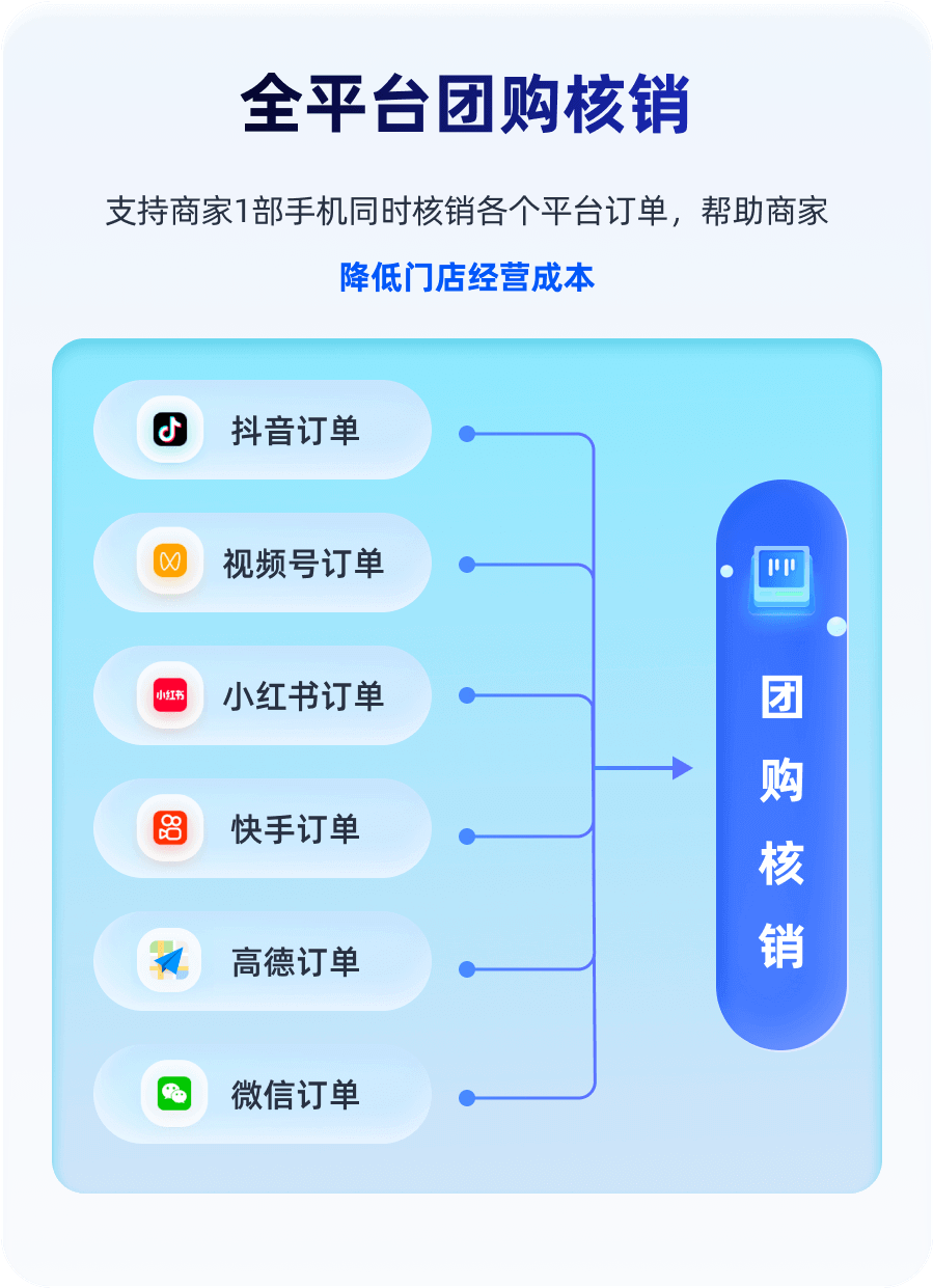 1部手机轻松核销抖音、快手、小红书 、视频号、微信、淘宝等渠道的订单